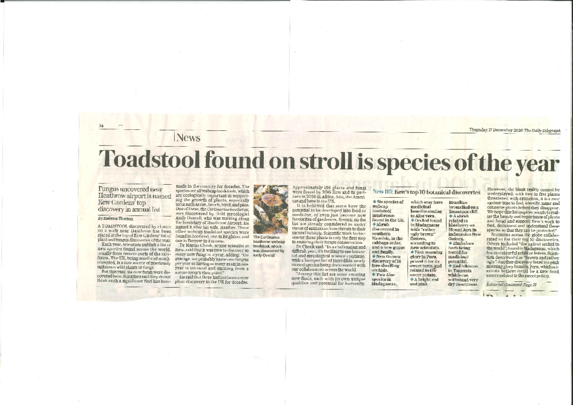 A new toadstool was discovered by Andy Overall, who oft leads our fungi walks, near Heathrow airport. Read the news article here or wikipedia entry. December 2020 |